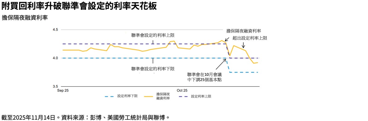 事實上,利率突升常在季末或結帳高峰期出現,目前利率也已回到正常區間,但為何仍引發市場關注?主要與觀感和透明度有關。在資金市場中,若銀行向聯準會借錢,容易被解讀為面臨流動性問題,因此往往寧願選擇其他融資工具。另一方面,市場上資金量雖創歷史新高,但在聯準會降息之下,資金開始改買國庫券(T-Bills),銀行可用於短期融資的資金反而變少。