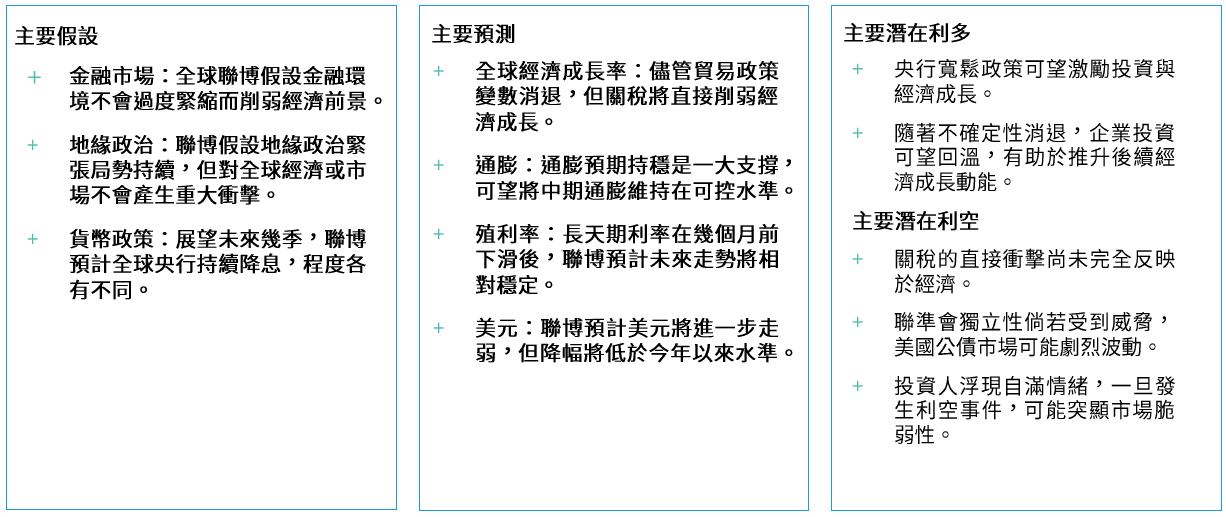 儘管如此,全球經濟成長走勢持續聯博過去幾次展望報告所述。經濟政策變動預計仍舊不易引發全球經濟衰退,主因關稅制度大致塵埃落定,不確定性消退,企業信心可望回溫。然而,即便不確定性減弱,主要經濟參與者 (economic actor) 仍須面對關稅的具體影響。成熟市場的經濟已經趨緩,聯博預計未來將持續如此,因為企業的投入成本增加,消費者亦面臨物價上漲的現實。