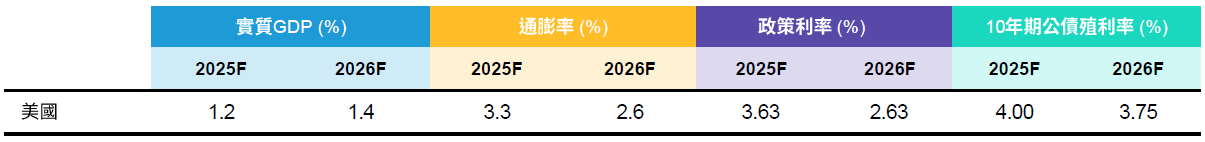 經濟成長動能減緩的同時,物價正逐漸攀升。自4月份宣布關稅以來,美國商品價格大幅走高,而隨著企業將關稅成本轉嫁至消費者,聯博預計物價將進一步攀升。儘管如此,通膨預計不易重返疫後高檔水準,而通膨預期持穩,亦顯示市場普遍抱持相同看法。這是利多消息,代表聯準會得以持續降息,避免就業市場嚴重疲軟,進而限制目前經濟趨緩的程度,並為2026年經濟回溫奠定基礎。聯博預計,聯準會的降息速度將略快於目前市場預期,此次週期的政策利率預計降至3%以下。