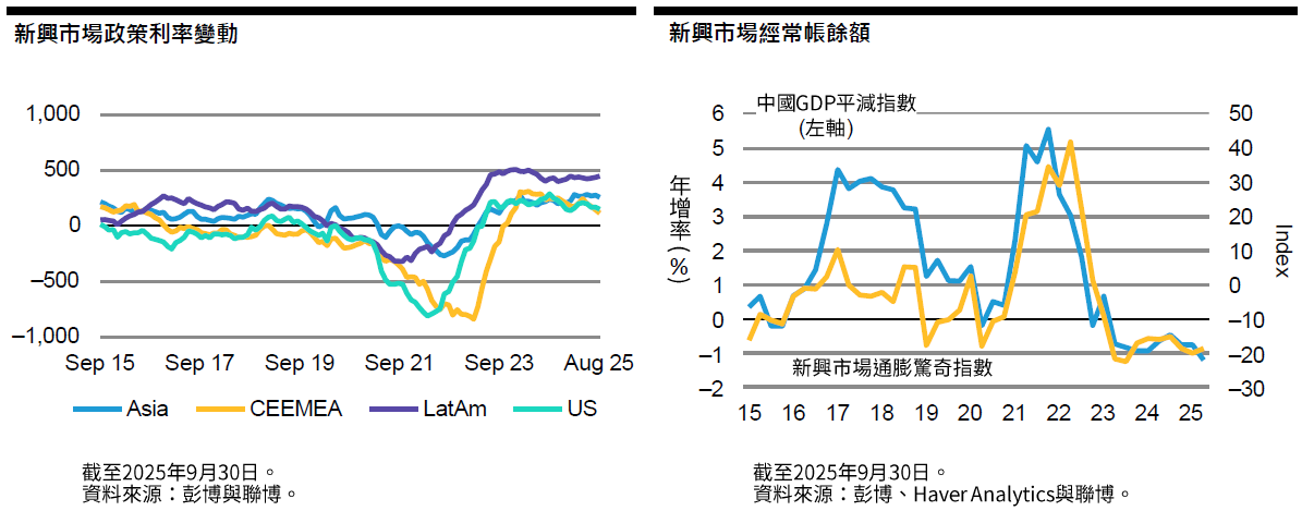 新興市場央行亦已大幅降息,而當地貨幣兌美元走強,亦為許多國家帶來進一步寬鬆的空間。全球經濟趨緩但不衰退,預計有利於新興市場,因為新興市場的收益高於多數成熟國家。貿易政策風險仍在,許多國家在衡量對美與對中關係陷入兩難,各國預計基於地緣政治與經濟因素可能有不同作為。