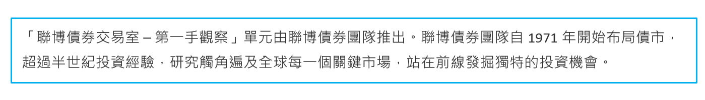 本文提及之經濟走勢預測不必然代表本基金之績效,本基金投資風險請詳閱基金公開說明書。本文件反映聯博於編製日之觀點,其資料則來自於聯博認為可靠之來源。聯博對資料之正確性不為任何陳述或保證,亦不保證資料提及之任何估計、預測或意見將會實現。投資人不應以此作為投資決策依據或投資建議。本文件資料僅供說明參考之用。投資人投資以非投資等級債券為訴求之基金不宜占其投資組合過高之比重。個別有價證券僅為說明聯博投資哲學之表述,並非代表任何之投資建議。本文件所提之特定有價證券並不代表該基金所有買賣或建議,亦不應假設該等投資已經或將有獲利。本文件原始文件為英文,中文版本資訊僅供參考。翻譯內容或未能完全符合原文部分,原始之英文文件將作為澄清定義之主要文件。