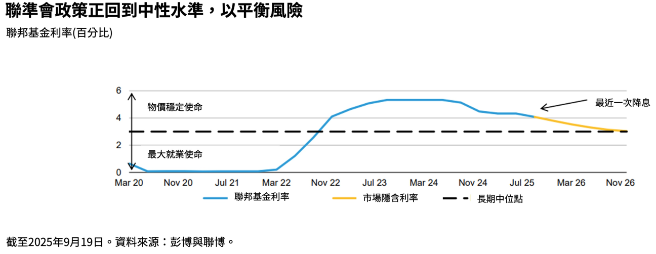 聯準會在9月17日進行25基本點的「風險管理」式降息,將目標區間降至4.00%-4.25%。其聲明與經濟預測摘要為年底前進一步寬鬆保留空間,市場解讀整體偏平衡而非鴿派。 8月CPI月增0.4%(年增2.9%),核心產品類CPI有些走強,但住房通膨下降仍相當緩慢。價格壓力雖在消退,但仍不均衡,關稅壓力已開始滲入商品價格。