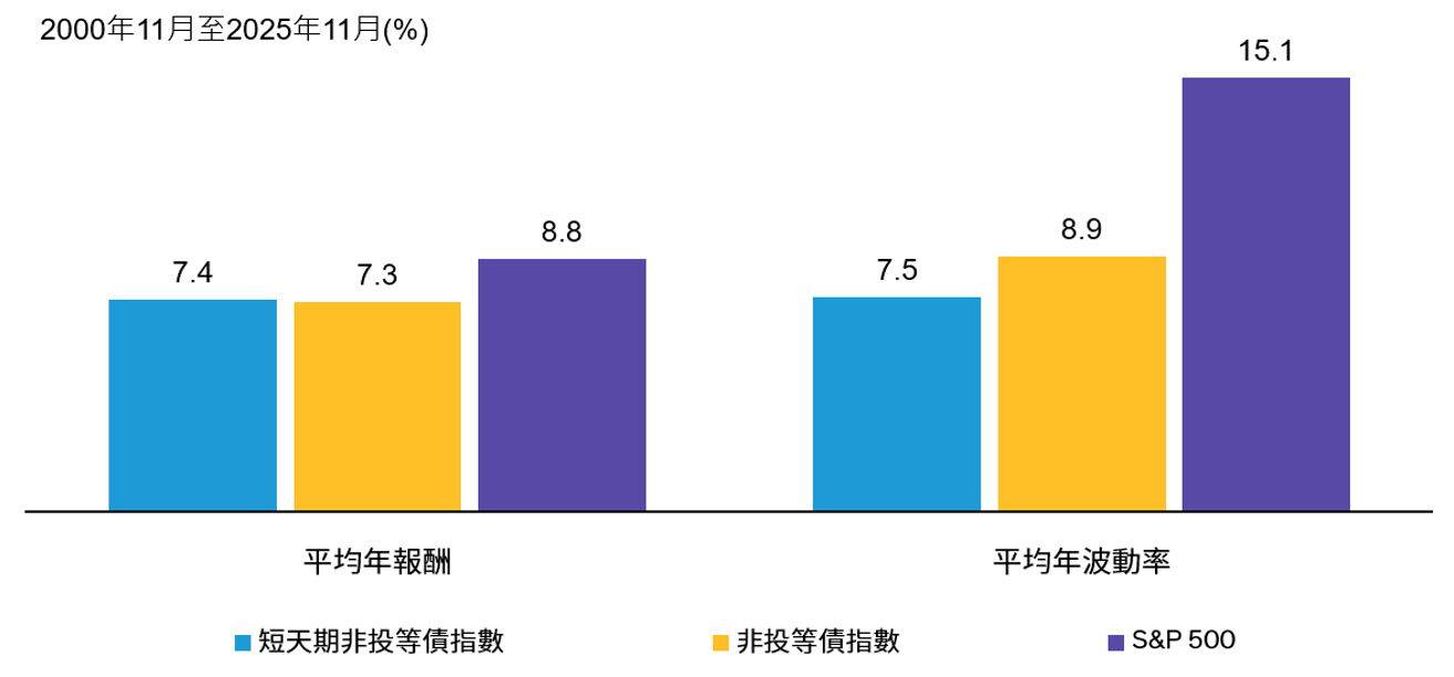 過往績效不保證未來結果。投資人無法直接投資指數,且指數表現不代表任何聯博基金之績效表現。指數未經管理,因此報酬未反映主動式基金管理之相關費用與支出。非投資等級債以Bloomberg US Corporate High Yield指數代表。短天期非投資等級債以Bloomberg US 1–5 Year High Yield指數代表。資料來源:彭博、晨星與聯博。