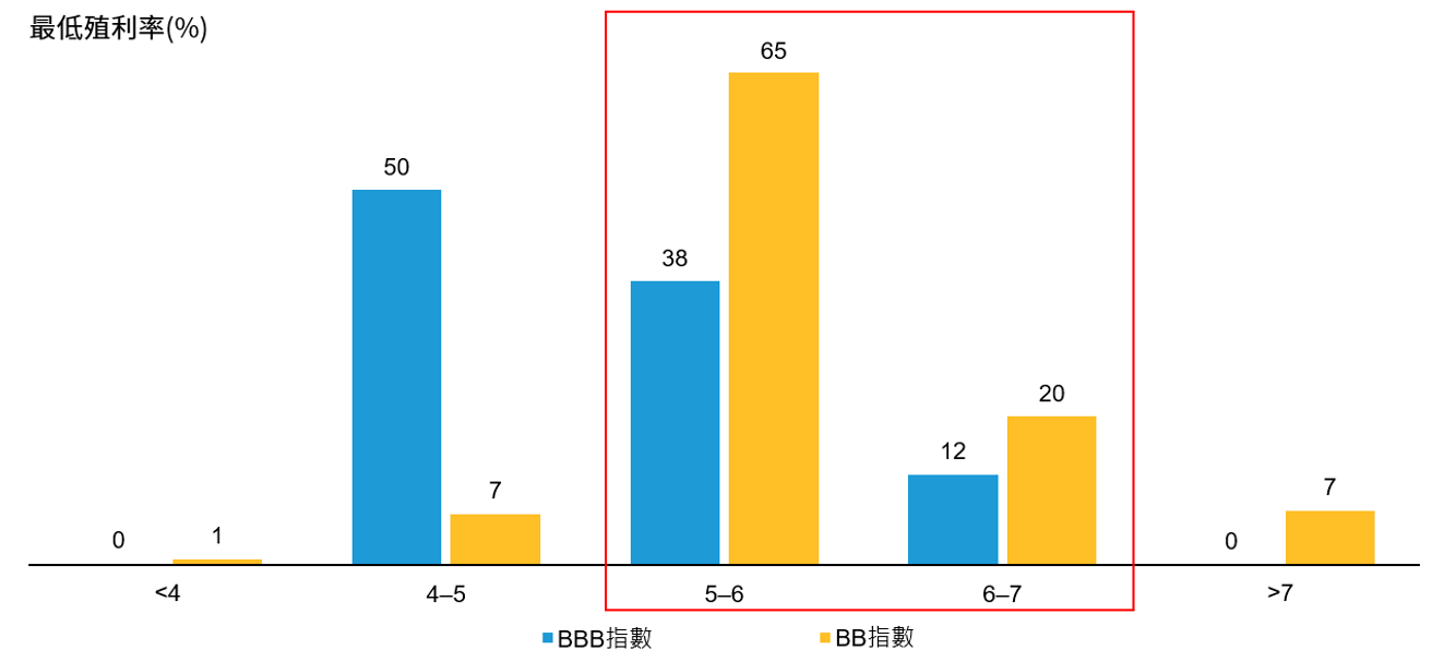 圖二:目前約50%的BBB等級債殖利率水準與BB等級債相近
