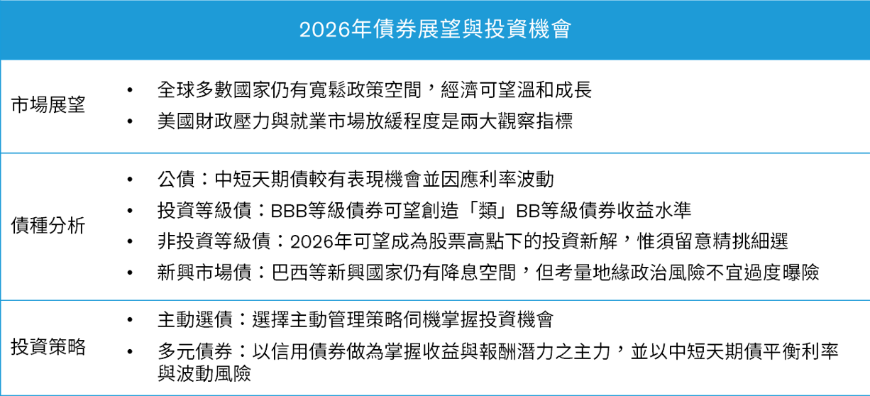 整體而言,2026年料將是波動與挑戰不斷的一年,在近年追逐資本利得的市場氛圍之中,不妨將目光適度轉向固定收益資產,特別是投資等級債與非投資等級債。透過多元債種的配置,並結合主動式管理,有助掌握具吸引力的收益水準並嚴抗波動風險。
