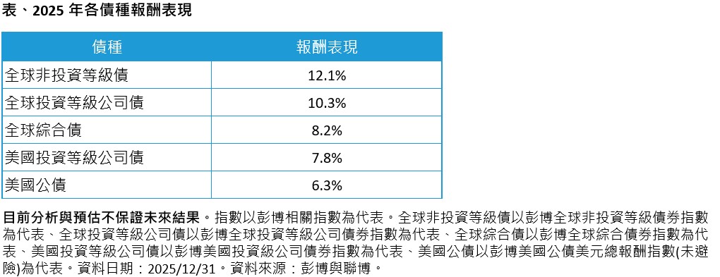 1過往分析僅供說明,不保證未來結果,投資人無法直接投資指數。非投資等級債券採彭博美國非投資等級債券指數,台灣高股息採富時台灣證券交易所台灣高股息指數,美股採S&P 500指數。報酬率:非投等債7.3%、美股8.8%、台灣高股息10.3%;波動度:非投等債8.9%、美股15.1%、台灣高股息19.9%。投資人無法直接投資於指數,指數不包含共同基金之銷售費用或營運費用,這些費用將會造成總報酬減損。資料時間:2000/11/30-2025/11/30。資料來源:彭博、聯博。