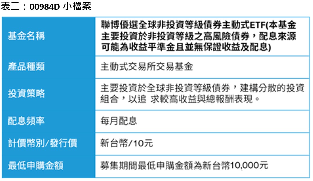 聯博投信旗下首檔主動式非投資等級債券ETF—00984D聯博優選全球非投資等級債券主動式ETF (本基金主要投資於非投資等級之高風險債券,配息來源可能為收益平準金且並無保證收益及配息) 由聯博債券投資團隊2主動選債,主要聚焦全球已開發國家非投資等級企業債,彈性配置各信評非投資等級債券,並分散配置消費、金融、能源等多元產業3。聯博00984D已於1月12日展開募集,1月16日募集結束,每股發行價格定為新台幣10元,並採每月配息機制,投資人不妨把握最後上車機會!