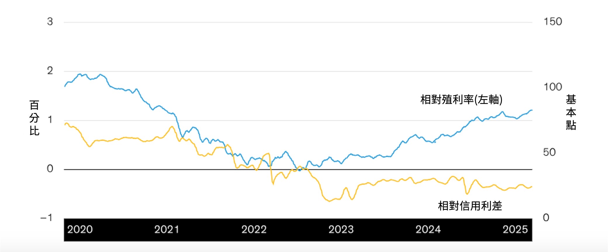 過往分析僅供說明,不保證未來結果。相對殖利率係指彭博美國長天期公司債指數與中天期公司債指數的殖利率差距。相對信用利差係指彭博美國長天期公司債指數與中天期公司債指數的信用利差差距。資料截至2025/12/31。資料來源:彭博與聯博。