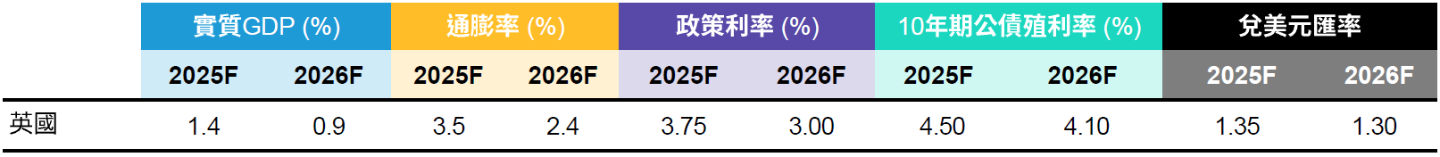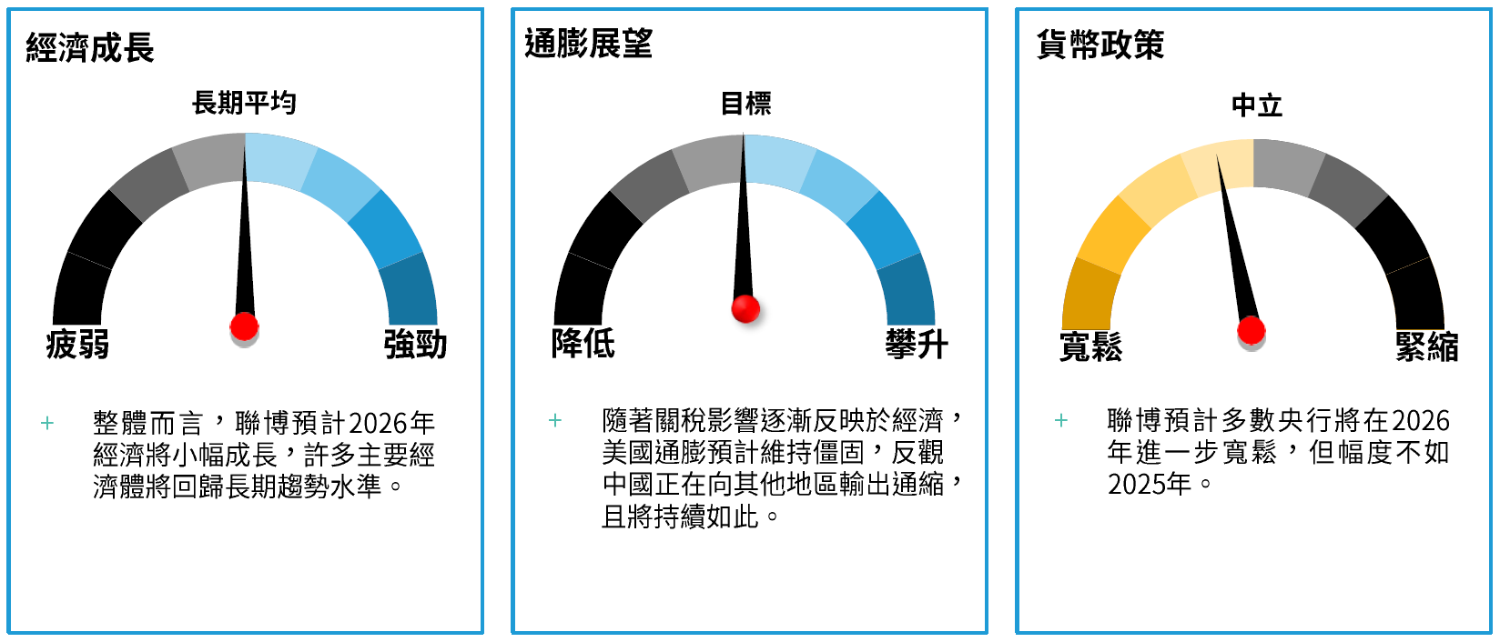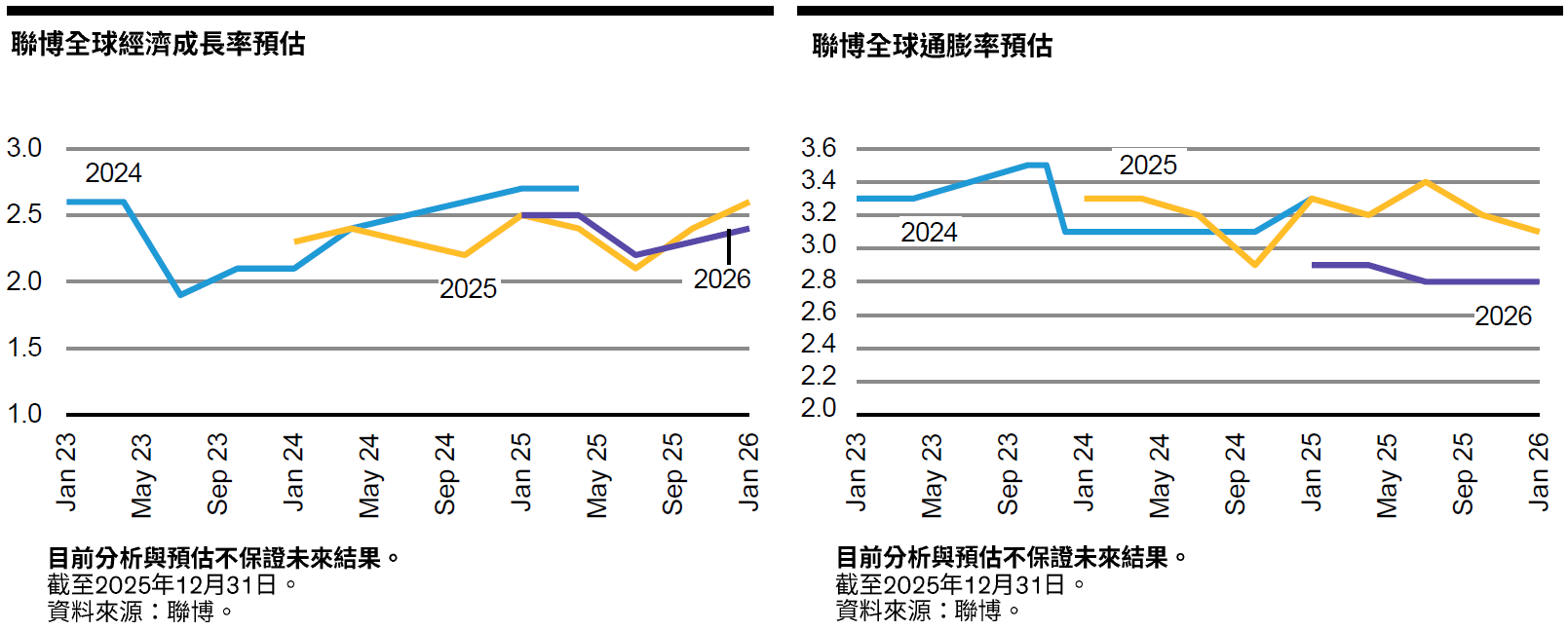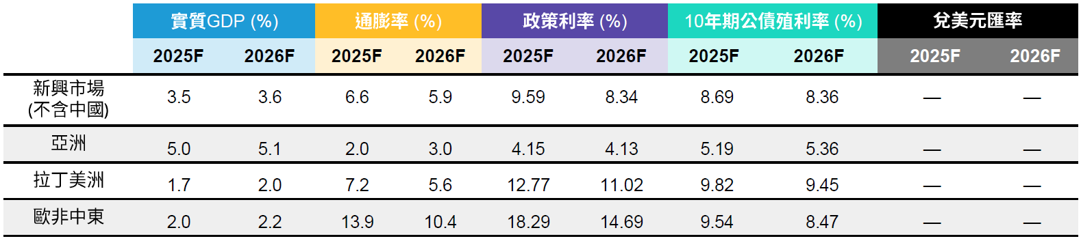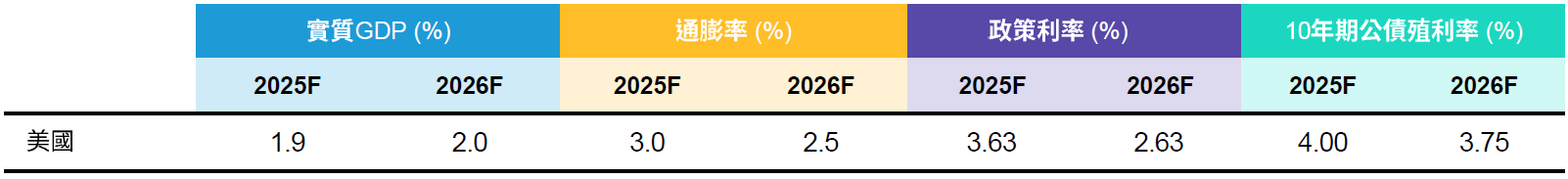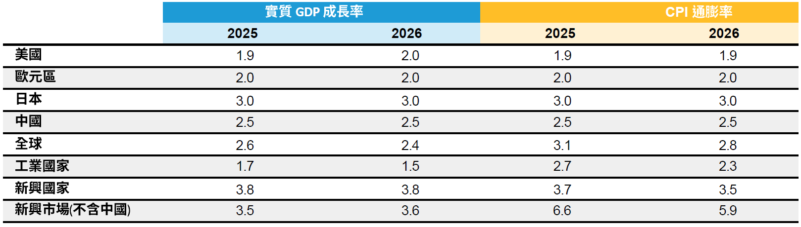 * 美國GDP預測為第四季年增率,其餘為全年年增率;美國CPI為核心通膨率,其餘為主要通膨率。截至2025年12月。