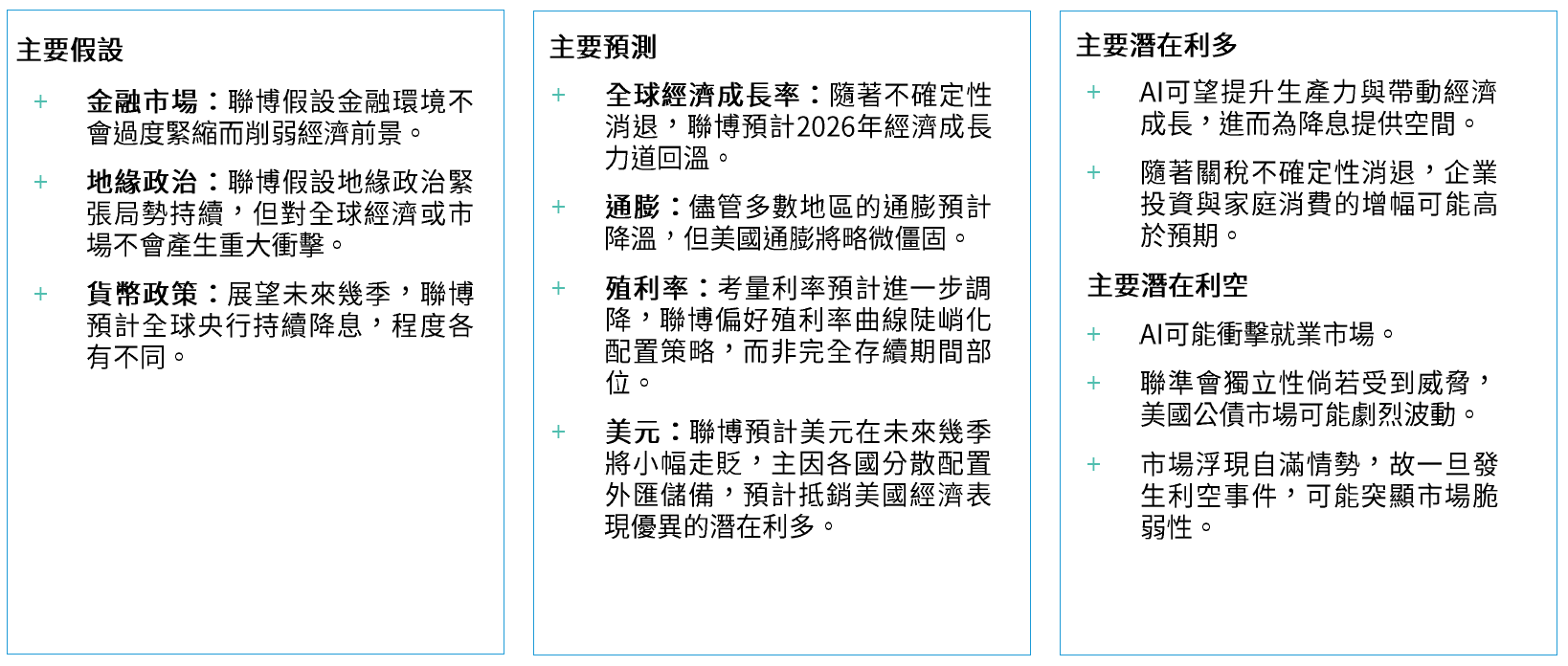 總經態勢時序進入2026年,全球經濟態勢大致不變,故聯博的上半年展望跟2025年底大同小異。聯博持續認為,全球經濟在未來幾個月、乃至幾季將持續擴張,成長力道固然可能不如歷史趨勢,但可望持續支撐金融市場。聯博的基本假設相對溫和,上檔與下檔風險相當平衡:經濟可能明顯加速,但也可能明顯放慢。