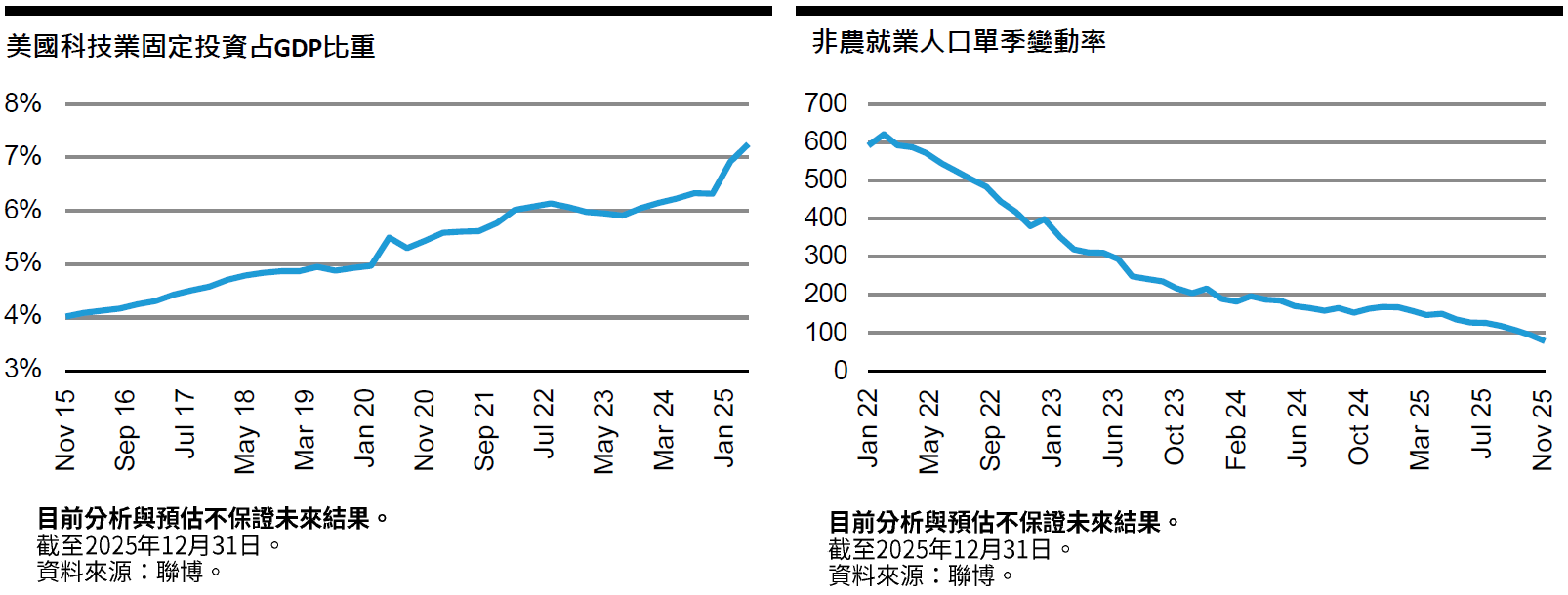 反之,倘若AI投資在短期展現效益,就業市場可能受到一定程度的衝擊,尤其就業需求目前又已經疲弱。現階段而言,儘管就業需求出現疲態,但就業供給亦逢移民政策利空,故供需稍有抵銷,但並非完全平衡,因為過去幾個月失業率持續攀升,顯示需求下降速度快於供給。就業需求倘若進一步轉弱,企業可能從「減緩招聘」轉為「大規模裁員」,對經濟造成更嚴重的衝擊。