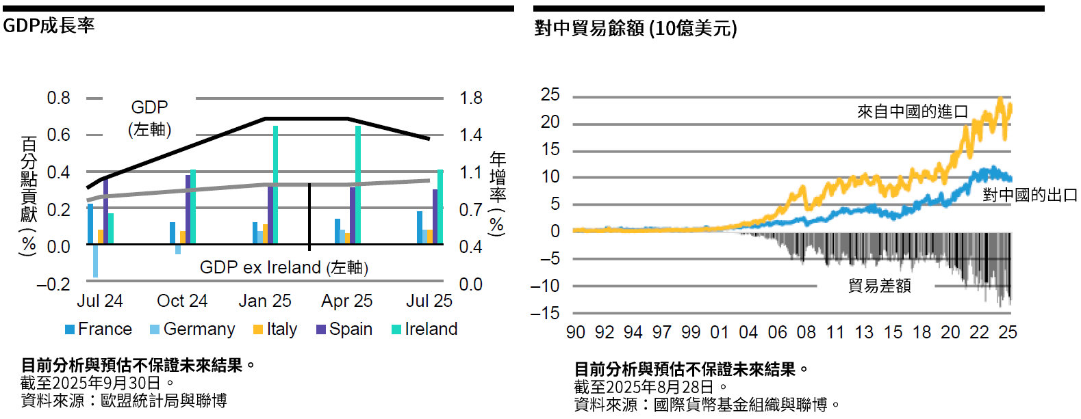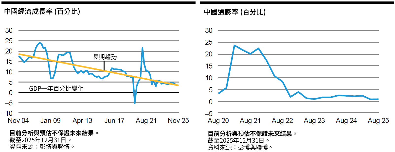 中國方面,關稅衝擊讓原已嚴峻的經濟情勢雪上加霜。內需維持疲軟,未經通膨調整的名目GDP成長率處於數十年低點。考量經濟成長動能已經轉弱,中國政府這時如果放慢生產,恐怕危及就業市場。但高關稅導致前進美國市場的誘因降低,加上內需市場無力消化出口商品,中國被迫把焦點放在其他貿易夥伴國,對亞洲各國的貿易激增,對歐洲與南美的出口表現亦大幅成長。換言之,中國正在將通縮輸往其他國家,藉此維持國內產能。現階段而言,中國經濟體系大致穩定,但暫時僅能勉強維持。為了持續支撐經濟,聯博預計中國在2026 年將進一步放寬政策,但值得注意的是,未來政策寬鬆主要在於管理經濟下檔風險,而非刺激經濟加速成長。