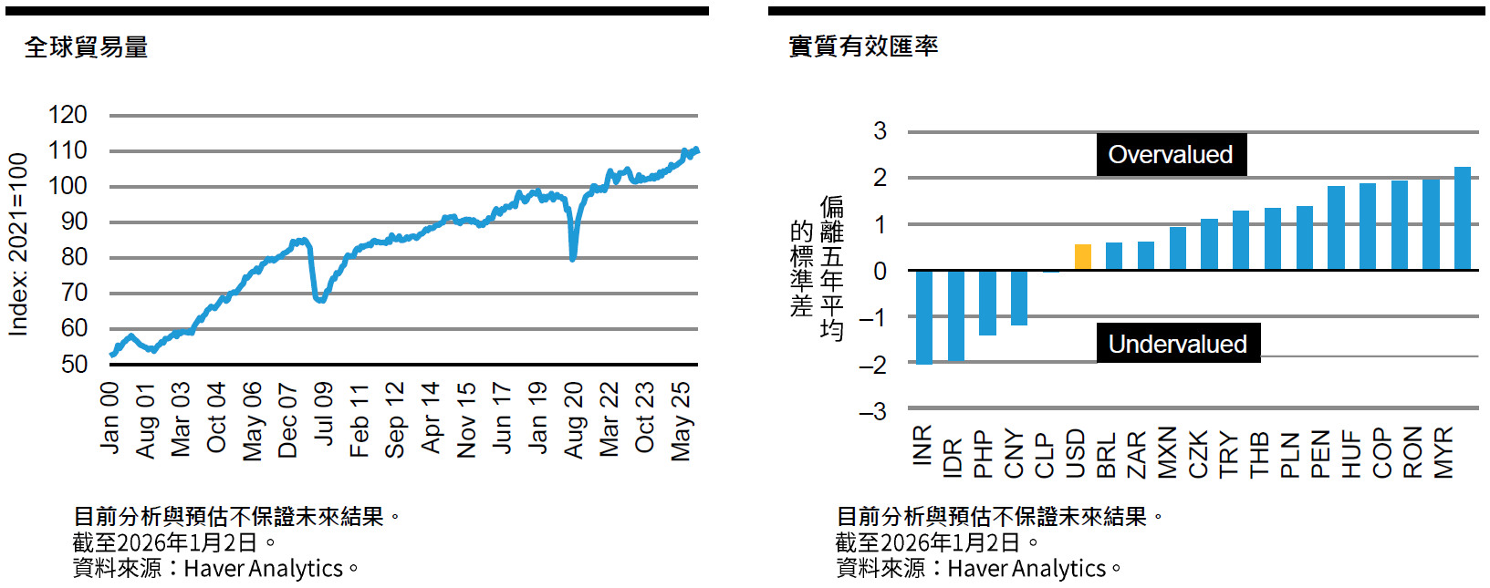 即使中國經濟只是勉強維持現況,預計已足夠支撐整體新興市場,因為新興市場的利率偏低,帶動內需相對強勁,且財政與外部動能穩健。儘管美國介入委內瑞拉內政可視為個別事件,但反映出整體地緣政治風險可能蔓延至其他地區,不容忽視。