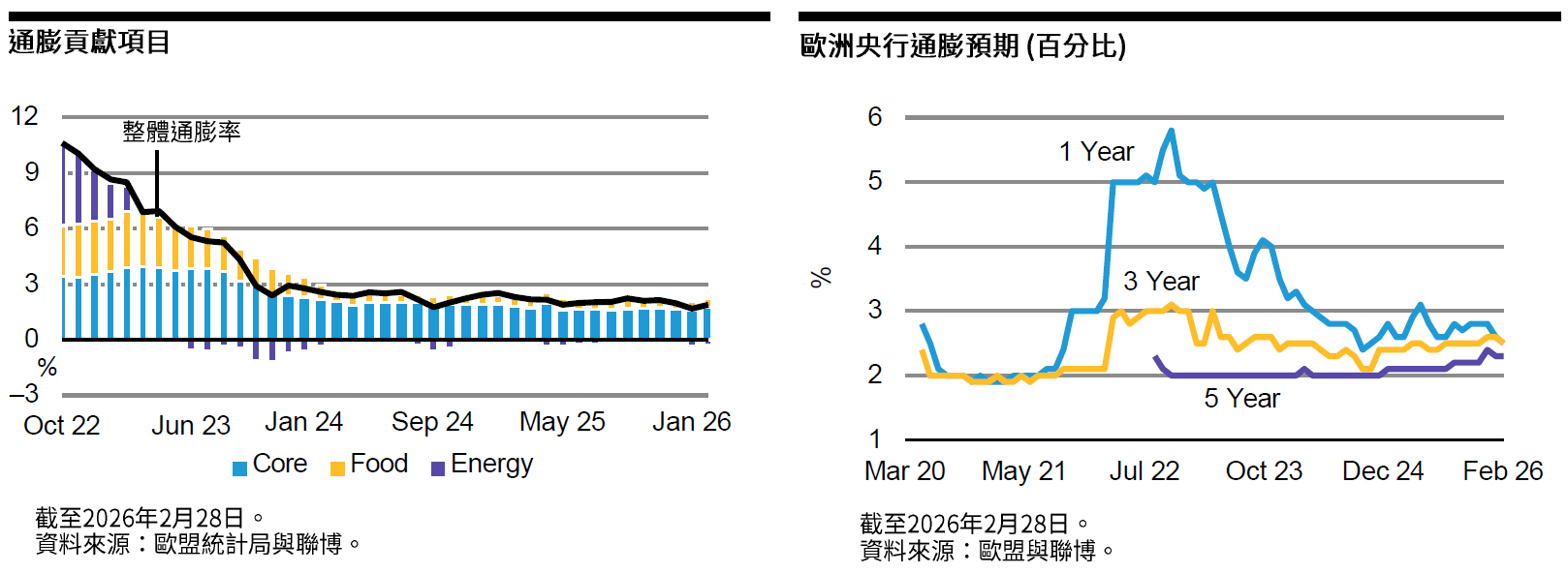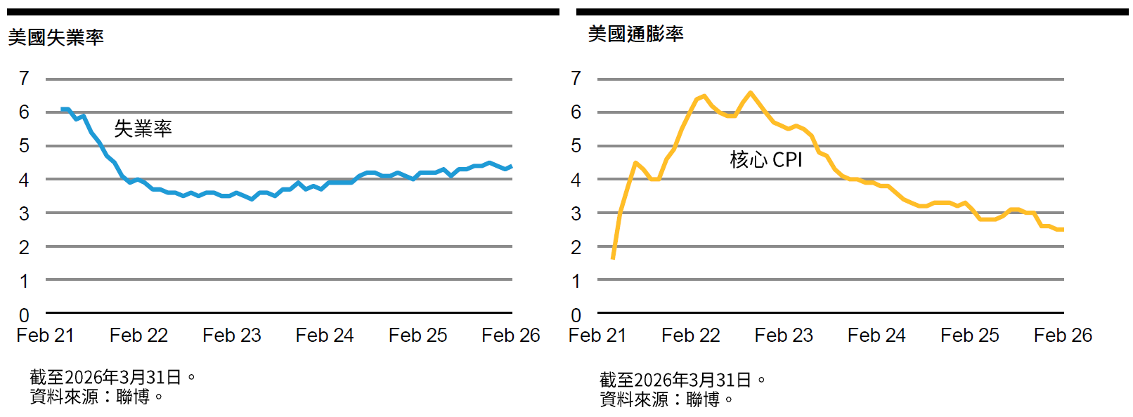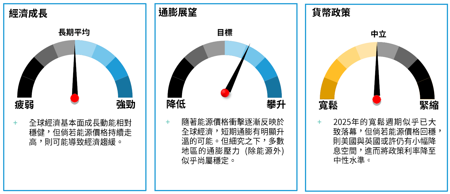 金融市場目前的關注重點在於,貨幣政策如何因應這波能源價格衝擊。答案一部分取決於各大央行的目標,以及戰爭對經濟造成的最終影響。以美國為例,聯準會的雙重使命在於穩定物價與充分就業,而從歷史經驗可知,即使油價增勢可能短暫推升主要通膨率,但聯準會可能暫時忽略,轉而力求維持就業市場穩定。如此立場不代表聯準會降息,但確實降低了以升息因應油價衝擊的可能性。當然,倘若通膨預期顯著升溫,情況將另當別論。值得慶幸的是,即使石油與汽油價格已經激增,通膨預期仍舊持穩。現階段而言,聯博持續預計聯準會將在未來幾季逐步降息,但考量目前市況不明,任何預測均可能變動。