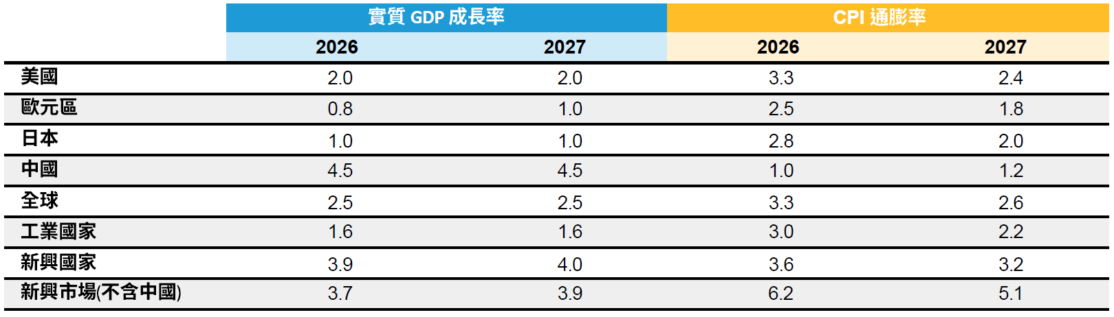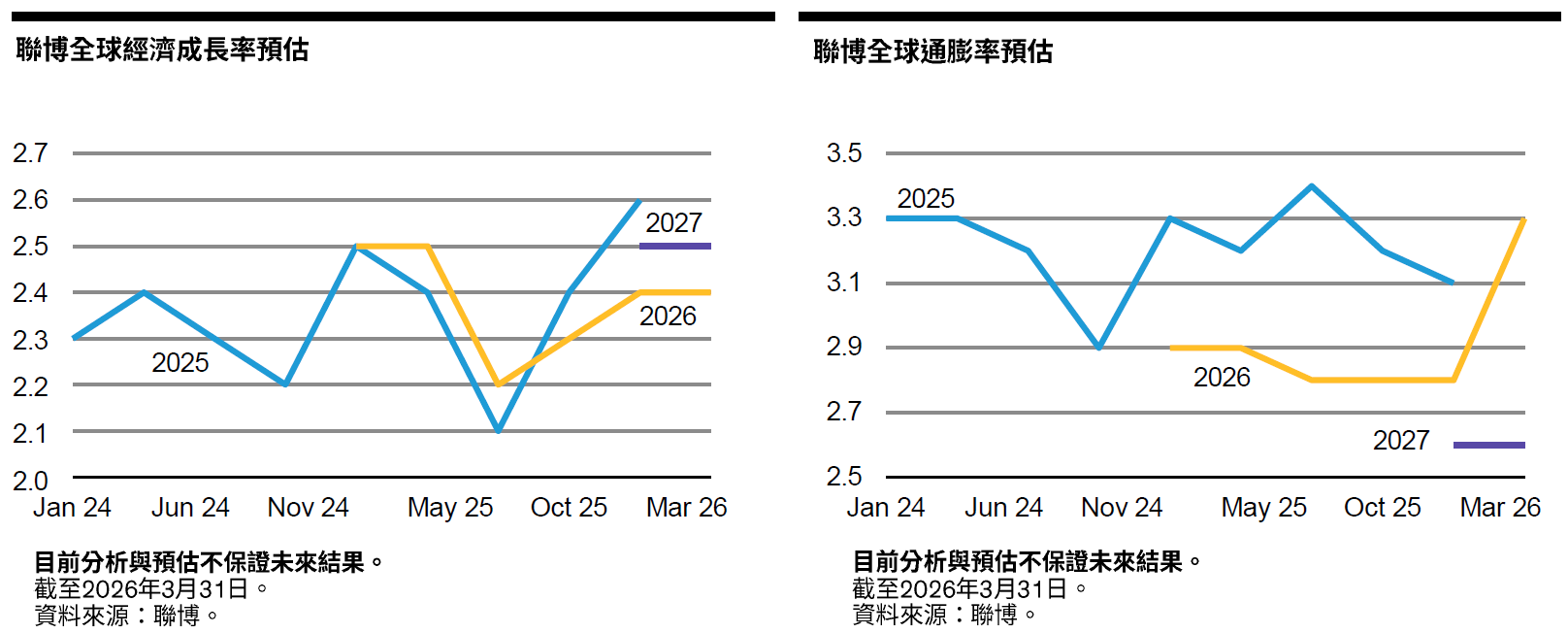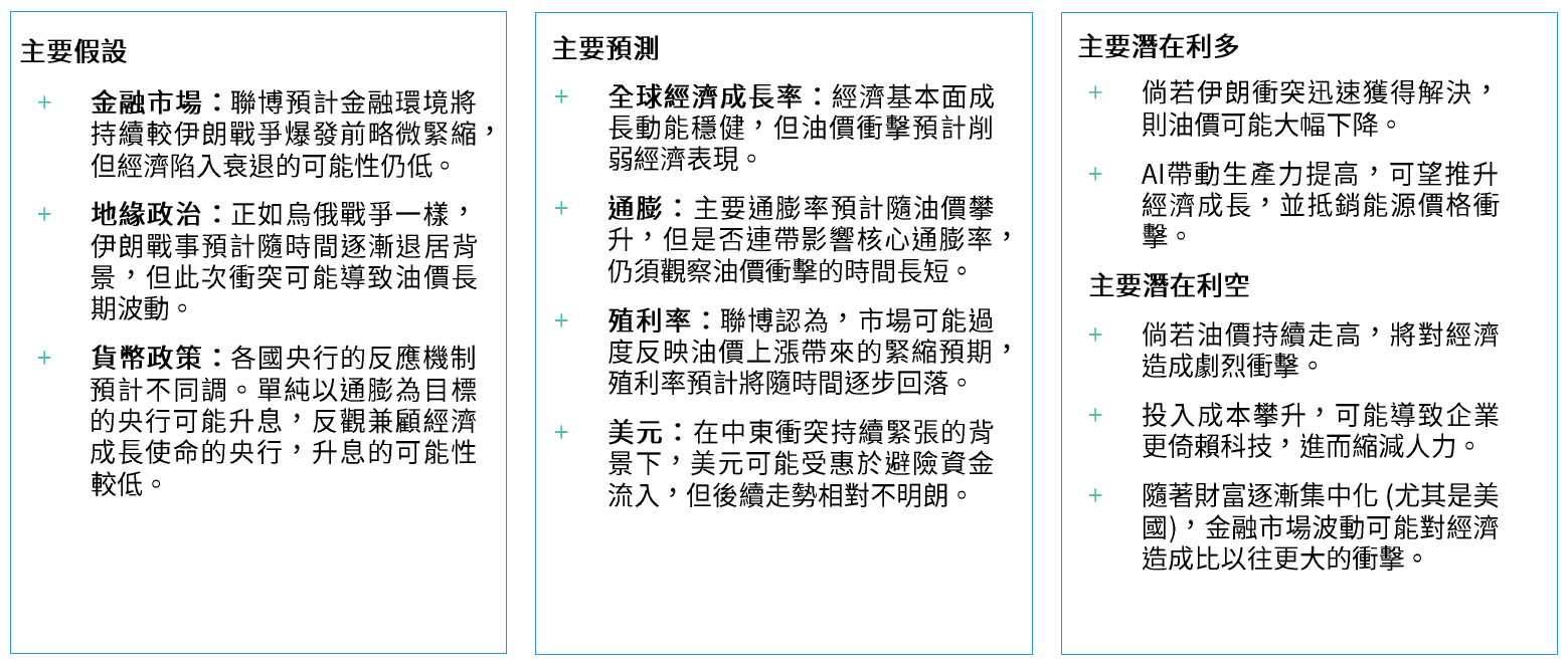 但衝突演變至今,現階段似乎尚不至於將全球經濟推向通膨螺旋(inflationary spiral)或經濟衰退。儘管聯博預計通膨將略高於先前預測,經濟成長動能亦將低於先前預期,但值得注意的是,全球經濟近年已安然度過諸多風暴。而至少到目前為止,伊朗戰爭固然導致能源漲價,但情況不如2022年俄羅斯入侵烏克蘭時嚴峻。經濟起始基期亦是關鍵;全球經濟體質在中東衝突爆發前相對健全,有利於緩衝利空衝擊。