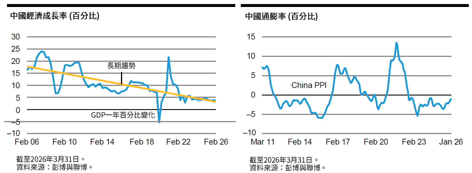 從很多方面來看,亞洲國家特別容易受到油價利空的衝擊。除了馬來西亞之外,多數新興亞洲國家的多數能源需求仰賴進口。中國已建有石油儲備,足以緩衝短期衝擊,但長期仍難脫離全球市場波動的影響。考量中國的內需仍舊疲弱,原物料價格對其經濟的衝擊預計尤其嚴重。中國政府近期公布2026年經濟成長率目標,首度低於5%,但聯博認為需要進一步推出財政刺激措施,才能達成目標。