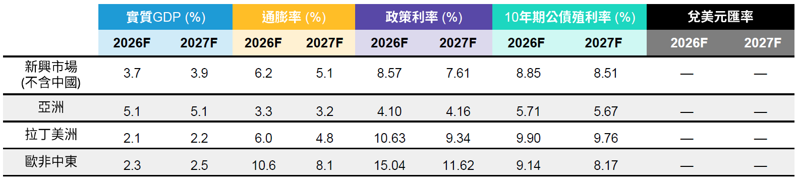 新興市場經濟體處於高度不明朗時期,經濟前景愈來愈受到大宗商品價格態勢的影響。隨著石油天然氣價格激增,短期主要通膨率已經攀升,導致先前相對穩健的總體環境趨於複雜。針對主要通膨率攀升,新興市場央行起初可能試圖忽略首波效應,但後續暫不因應的空間有限。倘若通膨預期出現脫鉤,或預測數字大幅偏離目標,則各國恐怕別無選擇,必須採取行動。在此情境下,新興市場經濟體可能陷入停滯性通膨。